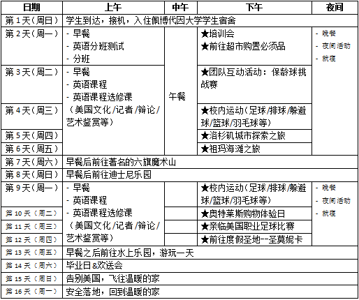 佩博代因大学是一所美国一流的私立研究型大学,位于加州马里布,在美国最美大学排名中位居第一。2017年USNEWS美国大学综合排名中,佩博代因大学位列最具价值大学第35名。 项目介绍 出发日期:7月8日-7月23日 适合年龄:10-16周岁学生 住宿条件:佩柏代因大学宿舍楼,2 人或 3 人间宿舍 涉及城市:美国洛杉矶、马里布、圣莫妮卡 项目亮点 1.纯美式夏令营,入住全美排名 46 的佩博代因大学,享受大学所有设施 2.有指导性,系统,充实的日程安排,国际营地,在充满娱乐性、趣味性的活动中结交来自世界各地的小伙伴 3.学术氛围浓厚,多种课程可选修,佩博代因本校教师授课(全部拥有TEFL/TESOL证书) 4.美式体育运动和游戏,让孩子在增强体魄的同时融入美国多元文化,充分供挖掘孩子的潜力和兴趣 5.度假胜地,四面环山,美国西海岸自然风光尽收眼底,感受加州和海滩风情 6.丰富有趣的短途游览,在迪士尼乐园和环球影城,水上乐园度过美好时光,观看美式职业棒球赛 7.全程航班直飞,优秀教师及资深领队全程陪同 选修课示例 1.美国文化 课程内容涵盖美国历史,美国重要的节庆日的由来,风土人情,社会文化等内容。 2.新闻事件 根据近期发生的新闻事件,学生需要自己角色扮演,分析事件和处理方法。 3.记者 老师会讲述作为一名记者的必要素质,采访与写作技能培养,让学生发现新闻,体验做一名专业记者。 4.辩论 按照基础理论、环节拆解、类型分析的顺序,分别讲述辩论的定义、基本态度、能力培养、组织方式。 5.艺术鉴赏 学生全面了解西方建筑、绘画、雕塑、工艺美术等,并分组讨论,动手制作艺术作品。 6.TOEFL/SAT 考题分析,详解,全真模拟。 行程安排 (以上行程仅供参考,具体安排可能会受天气等客观因素调整)点击图片可放大查看 夏令营团费:42800 CNY/人 费用用于: 1.营地费:包括课程费用及食、宿、特别惊喜等行程中注明的餐食; 2.旅游费:周末周边旅游费(包括行程中所列景点首道门票、导游、小费等); 3.交通费:包含往返国际机票、中国境内交通费(上海签证费交通费)等; 4.签证费及办理服务费等; 5.美国境外保险费; 6.陪同领队费用分摊。 费用不含: 1.办理护照费; 2.纯系私人消费:行李超重费用、特别餐饮费、电话费、洗衣费、私人购物与零用等; 3.行程中列明以外的景点或活动所引起的任何费用; 4.损坏公物及他人财务,学员自行承担法律责任及赔偿费用; 5.一次申请签证未通过,再申请时发生的签证费; 6.上述“报价包含”条款中未列明的一切额外费用。 7.因不可抗力的客观原因和非我方原因(如天灾、战争、罢工等)或航空公司航班延误、取消、使领馆签证延误等情况,我方有权变更行程,一切超出费用(如:在境外延期的签证费、住宿、餐食、交通等费用),均由学生自理。行程中如遇一日三餐在飞机上或是机场等,用餐自理。 参考航班信息 2018.7.8出发: CX5643 宁波—香港 0830 1045 CX884 香港—洛杉矶 1255 1135 2018.7.22返程: CX883 洛杉矶—香港 0025 0545+1 CX5640 Q2 香港—宁波 1115(7.23) 1330 作为宁波老牌教育机构 瀚森教育致力于 为宁波中学生带去更优质的海外教育资源 世界那么大,我想带你去看看~ 往期夏令营回顾